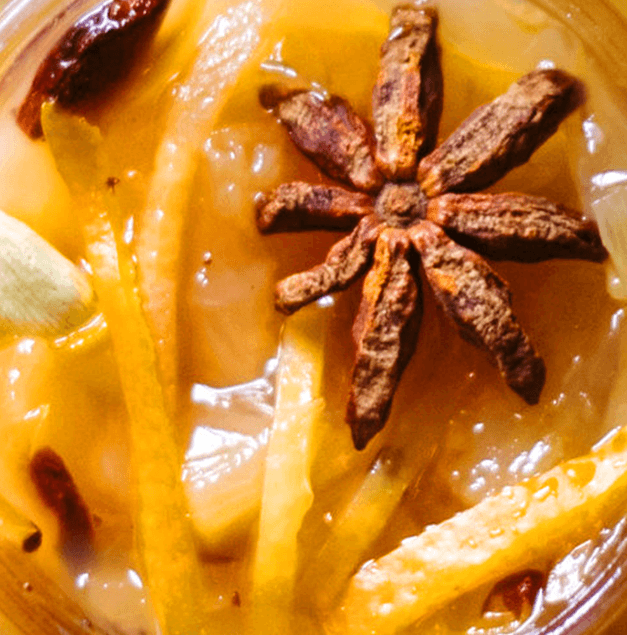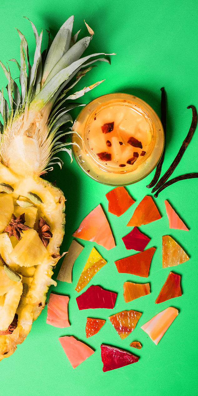 Il gusto dolce e profumato dell’ananas viene mescolato alle zeste di agrumi e a spezie lontane, quali anice stellato e cardamomo, creando un’esplosione di sapori e fragranze.